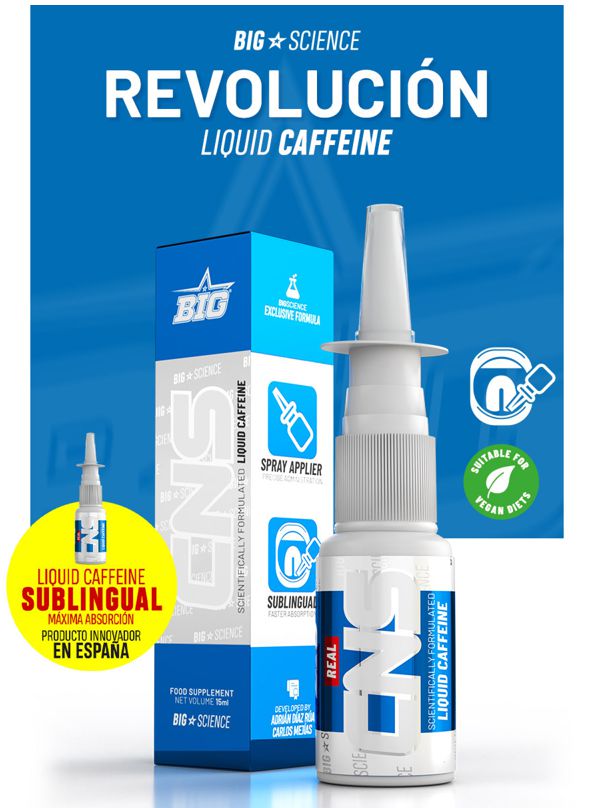 Real CNS es un suplemento de cafeína líquida en un cómodo formato con pulverizador, que se administra mediante pulsación en apenas unos segundos. De esta manera, se consigue una mayor velocidad de absorción y una mejora significativa en la biodisponibilidad, teniendo un efecto casi instantáneo. La cafeína es el producto estimulante por excelencia y con esta revolucionaria forma de administración en spray hemos logrado mejorar la experiencia y el uso de este fantástico ingrediente. RE-EVOLUCIONATE con Real CNS de BIGscience.