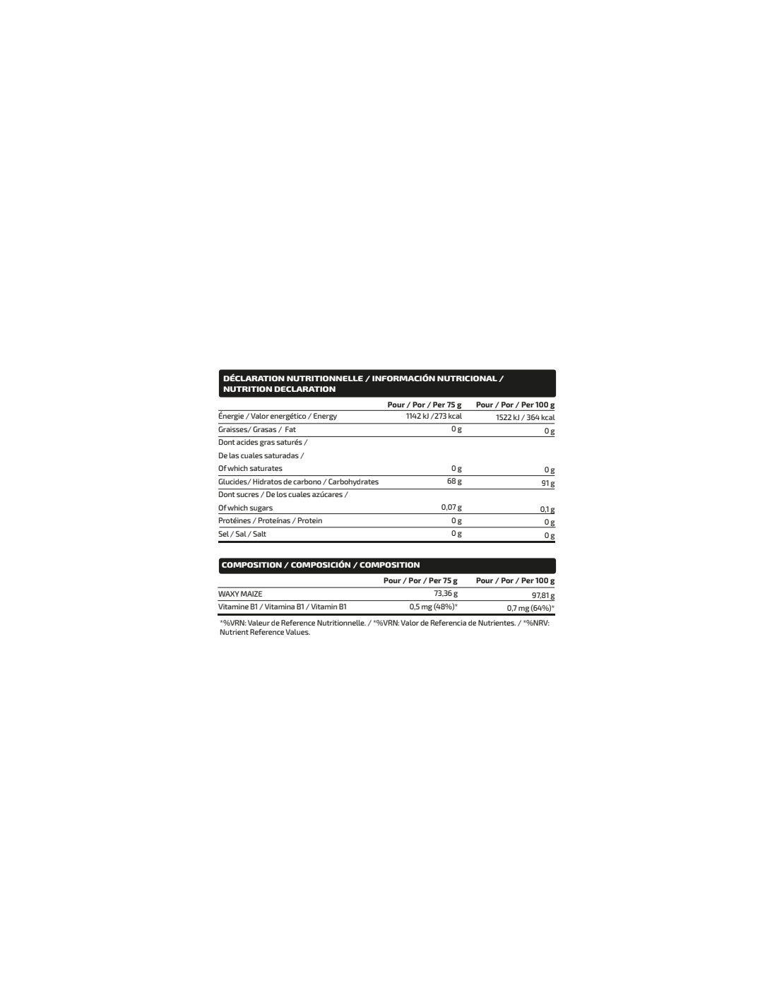 Un suplemento a base de almidón modificado y vitamina B1 siendo perfecto para aportar un extra de energía a la hora de afrontar los entrenamientos.